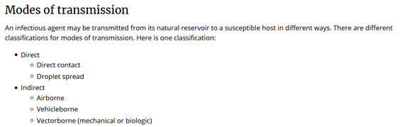 Mecanismos de transmisión: es la forma en la que el agente causal entra en contacto con el individuo susceptible o receptor. Depende de varios factores como la vía de eliminación, de la resistencia en el medio externo, de la puerta de entrada o del nº de microorganismos necesarios para producir la infección.