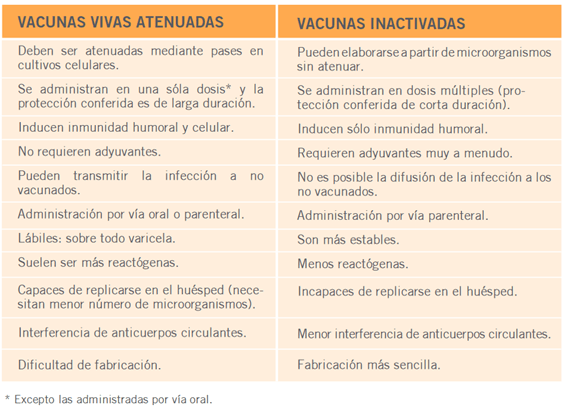 -Atenuadas: son microorganismos vivos con capacidad antigénica pero que han perdido su virulencia como resultado de sembrar repetidamente en medios de cultivo. Su inmunogenicidad suele ser larga e intensa ya que inducen inmunidad humoral y celular. Así que por lo común, suelen requerir dosis bajas de antígeno. Aspecto a tener en cuenta: dado que contienen una pequeña cantidad de un virus vivo debilitado, personas inmunosuprimidas o con enfermedades crónicas deben consultar antes de vacunarse. Además no podemos descartar la posibilidad de trasmisión a no vacunados.