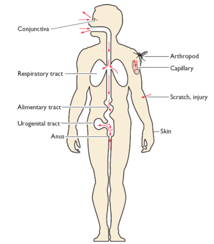 Las superficies del cuerpo humano sirven de puerta de entrada o lugares de infección y diseminación microbiana. Los más frecuentes serían el tracto alimentario, la piel (estreptococos, estafilococos y hongos), conjuntiva, vía respiratoria o urogenital.
