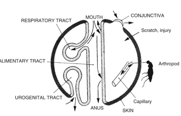La piel no es puerta de entrada exclusiva de muchos de estos microorganismos. Además, las infecc. pueden adquirirse por + de una vía. Las mismas vías sirven de entrada de agentes no infecciosos como toxinas ambientales que podrán ser ingeridas, absorbidas o inspiradas.