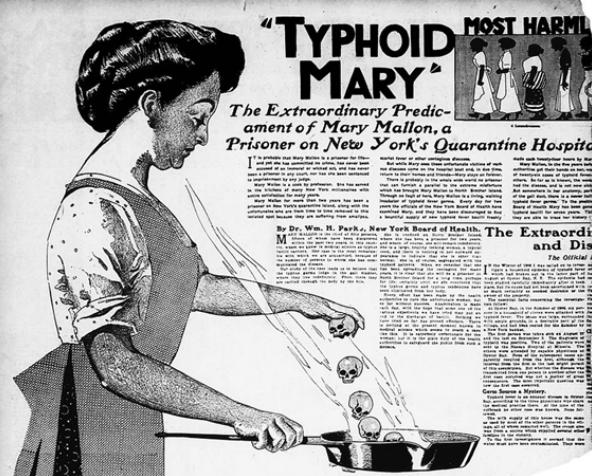 Uno de los ejemplos más conocidos de portadora a largo plazo fue Mary Mallon, más conocida como “Typhoid Mary”, que portaba Salmonella typhi y murió en 1938. Durante un período de muchos años, trabajó como cocinera en el área de la ciudad de Nueva York, pasando de un hogar a otro con diferentes nombres. Se consideró que había causado al menos 10 brotes de fiebre tifoidea que incluyeron 51 casos y 3 muertes.