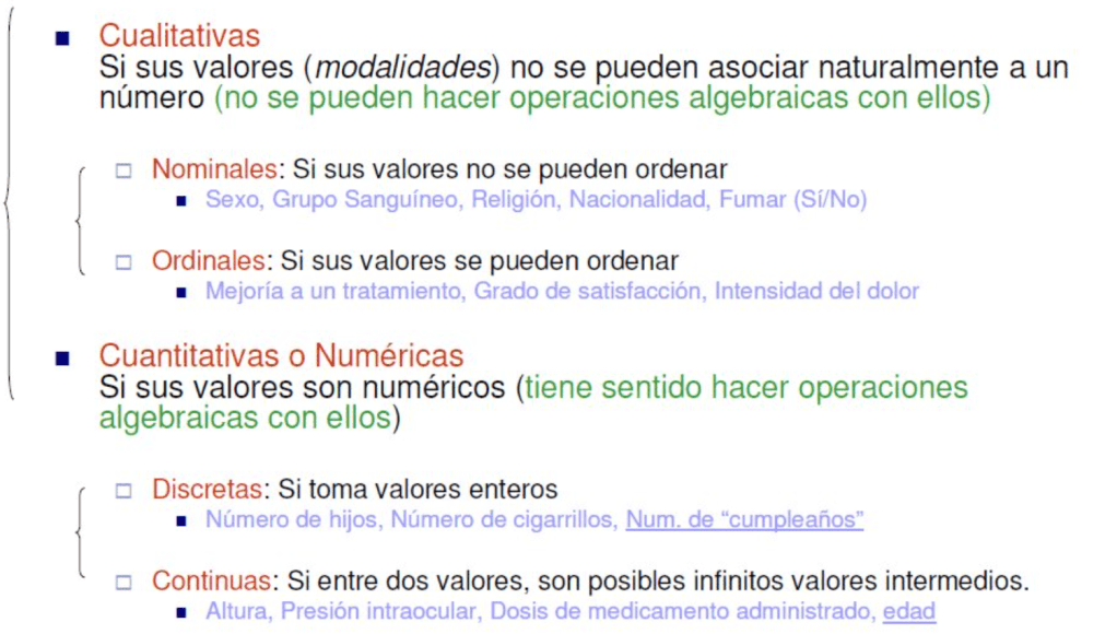 Cuando estamos midiendo características de los pacientes o personas que estamos estudiando, podremos hacerlo con aquellas que están definidas numéricamente, por ejemplo, la edad de alguien, 30, 20, 87… años. Otras veces, estaremos midiendo cosas como el tener por ejemplo la tensión arterial alta. En este caso anotaríamos que SI la tiene (si es así) o que NO la tiene ¿se entiende? Es fácil. Son ‘variables’ de otro tipo, que nos cuentan cosas de esa persona, pero que no podemos registrar con un número, como la edad.